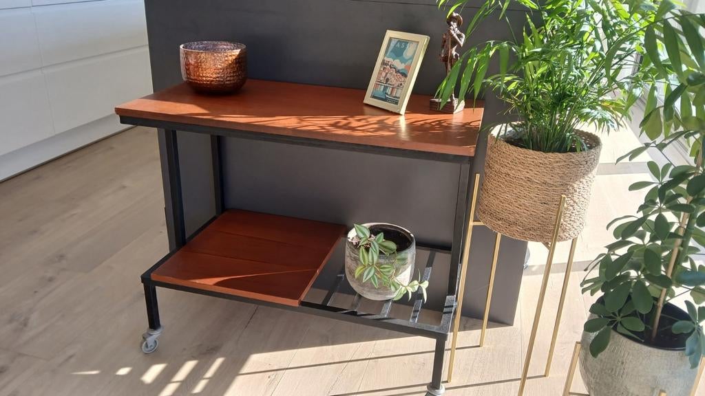28 mars 26AlexDeurne - Vintage platenspeler tafel / TV tafel jaren 70Vintage platenspeler meubel / tv meubel bijzettafel / plantentafel / teakhouten fineer planken / zwarte metalen frame / 2 niveaus/ afmetingen hoogte 66 cm lengte 73 cm diepte 38 cmEnlèvement