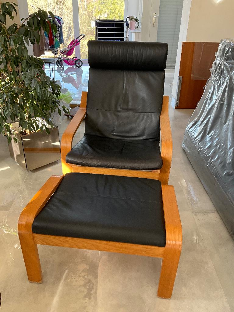 - Fauteuil et pouf Poang Ikea, cuir noir/marronQuelques traces d'usure, sinon en bon état. Nouveau prix de cette combinaison = 309€ à retirer au 2940 hoevenenUtilisé Enlèvement