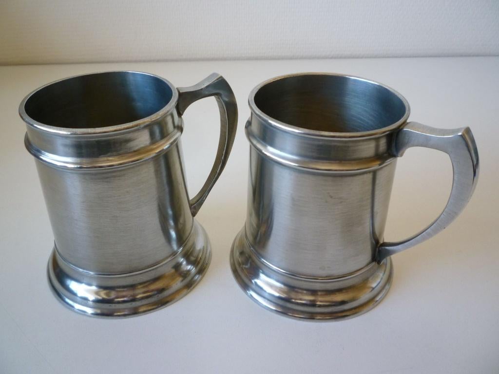 2 janv. 26EMJette - Paire de chopes en étain « Finstain »Belle paire de chopes à bière en étain lissé pur pinçonnées « finstain » maison très connue de postainiers hutois et datant de 1956 (estampié). Diamètre : 8cm hauteur : 11cm poids : 500grEnlèvement ou Envoi