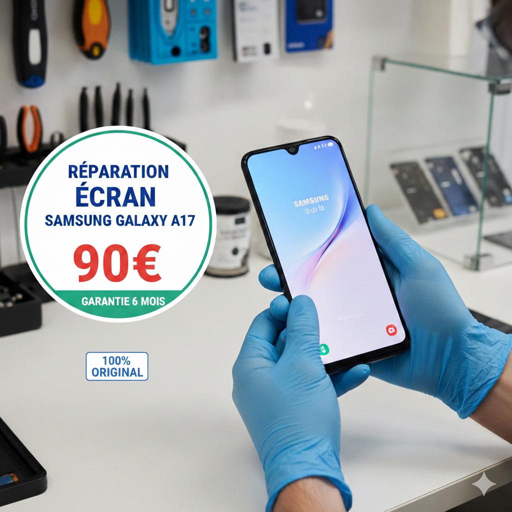 - Réparation écran Samsung Galaxy A17 pas cher Garantie 6 moisRéparation écran samsung galaxy a17 à 90€ faite en 1 heure seulement. Garantie 6 mois et facture. Nous avons les pièces en stock. Devis gratuit! L'écran de votre samsung a17 est cassé? Le tacEnlèvement