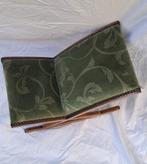 Aujourd'huiPub au topCatawikiToute la Belgique - Repose-pied - BoisPouf vintage en bois néerlandais des années 1950–1960, style mid-century modern, revêtement velours vert à motif botanique, clous décoratifs couleur cuivre autour du siège, dimensions 52,5 × 35 × 30 c
