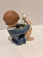 - Royal Copenhagen - john galster - Figure - Girl brushing CatSculpture en porcelaine royal copenhagen n°4631 «fille qui brosse le chat», dessinée par john galster, représentant une jeune fille en robe bleue qui brosse un chat blanc; porcelaine à glaçure sous ém