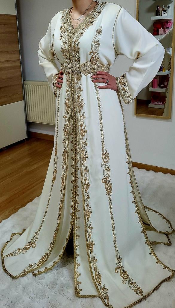 1 mars 26IhsaneVilvoorde - ROBE DE SOIRÉE MAROCAINE (takchita)• robe de soirée 2 pièces • portée quelques fois, traces d'usure sur la robe intérieure blanche (voir dernière photo) • longueur : 160 cm, largeur : 45 cm • la ceinture n'ePorté Enlèvement ou Envoi
