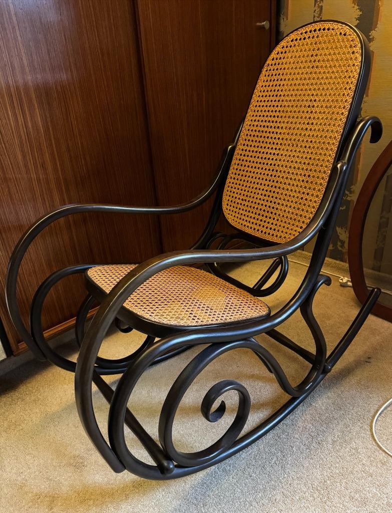 15 avr. 25MaesKeerbergen - Rocking chair bois style Thonet vintage (fauteuil à bascule)Dos et assise en cannage en très bon état couleur noyer. Hauteur 85cm, profondeur 88cm, largeur 51cm.Enlèvement