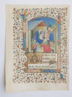 12 nov. 22beleteGanshoren - Manuscript - Miniature leaf from a latin Book of Hours ca.Feuille miniature originale d’un manuscrit latin d’un livre d’heures, xviie siècle environ, sans reliure, une page, représentant l’adoration des rois mages de marie et jésus, bordure florale dorée ric