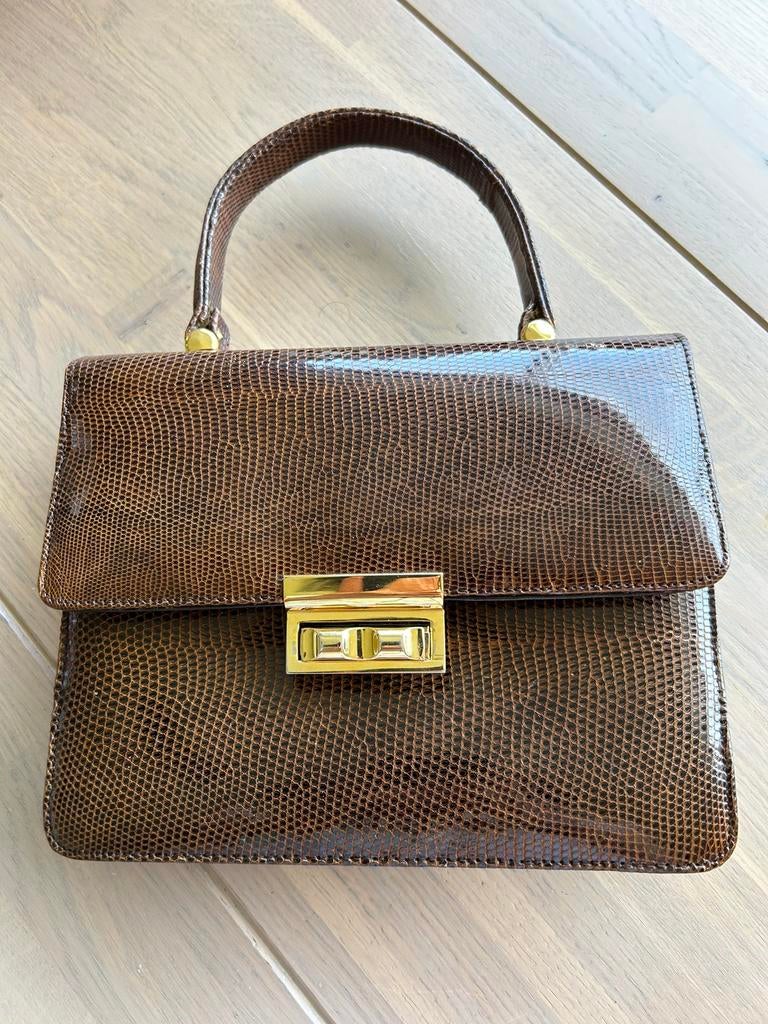 4 déc. 24antiekAalst - sac a main vintage en lizard/serpentCe sac à main vintage marron foncé de taille raisonnable est en lézard/serpent. Il date des années '50 et est toujours en excellent état. La dorure sur les anses et la fermeture sont également touEnlèvement ou Envoi