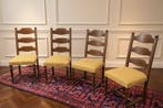 Avant-hierTimNivelles - Set aus 4 Esszimmerstühlen - Chaise de salle à manger -Ensemble de quatre chaises de salle à manger vintage en chêne massif, dossier en échelle de style provincial français, garnissage crème et brun, originaires du royaume-uni et datées des années 1960–19