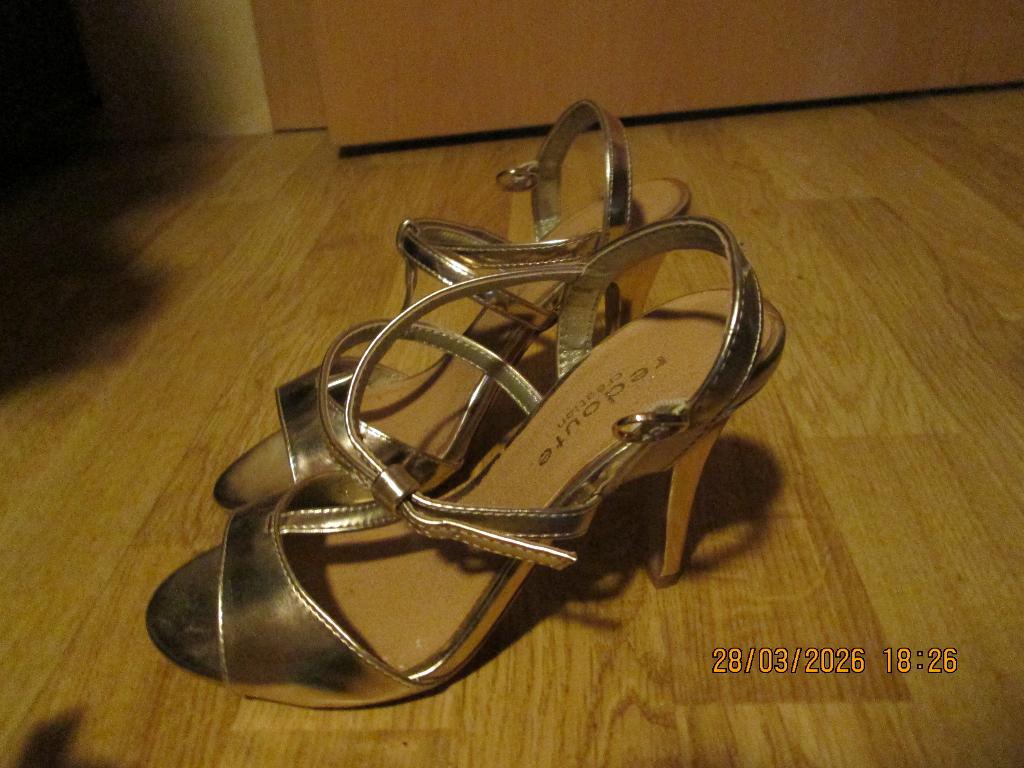 8 mars 26LeslieGerpinnes - 448* STYLE SHOES sandales hauts-talons super sexy (p36)448* magnifiques sandales de la marque style shoes couleur or, dessus cuir. Pointure 36. Hauts-talons de 14 cm avec plateau de 3 cm. Tout à fait neuves. Envoi bpost 6,4 €.Neuf Envoi