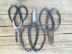 8 mars 26CarolinePeruwelz - Schaar (3) - Bonsaiciseaux / Ikebana. Japanse Tsuchime.Doosje van drie japanse vriends chijfjes van bonsai- en tuinschaar uit gefl vrongen koolstofstaal met tsuchime-afwerking, daterend uit 1950–1960 en afkomstig uit osaka, noir, 11 cm breed, 1,4 cm diept