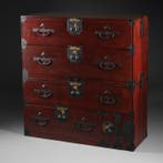 8 avr. 26DorianAntwerpen - armoire à tiroirs - bois de Keyaki (Zelkova), bois de SugiCabinet de tirants ishô’dansu japonais en deux sections de la période meiji précoce, façades de tiroirs en keyaki et cadre en sugi, ferrures en fer et plaques de serrure gravées dorées ornées de motif