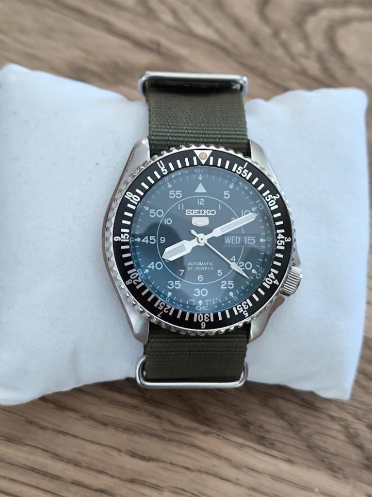 27 août 25yoAarschot + Deel Begijnendijkpilote Seiko SKX007/SKX009 pilote/militaire 7S26Montre-bracelet Seiko Enlèvement ou Envoi AcierSeiko skx007/skx009 pilot/military 7s26 fabriqué par monsterwatches netherlands, celui-ci est connu pour ses pièces très bien finies et originales. La montre n'a eu pratiquement aucun temps d'usure (portée au maximum 5 fois), elle est donc da...Aarschot + Deel Begijnendijk27 août 25 - Seiko SKX009 KTestée à 10 bar année de production : juillet 2009 numéro de série : 973313 cadran : cadran original day/date : romain - anglais aiguilles : originale couronne : originale verre : original insert de lComme neuf Enlèvement ou Envoi