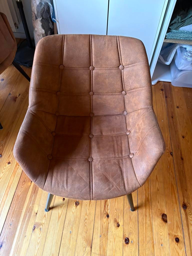 30 mars 26M.S.Torhout - 4 cognac eetkamerstoelen – microvezel – Weba –Set van 4 stijlvolle eetkamerstoelen in cognac microvezel van weba. De stoelen zijn max. 2 Jaar oud en bijna niet gebruikt, dus nog in zeer goede staat. Comfortabele zitting met armleuningen en stevigComme neuf Enlèvement