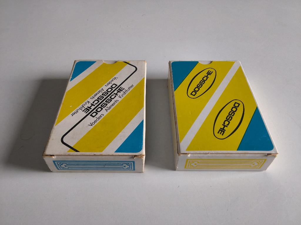 - 2 anciens jeux de cartes à jouer aliments DOSSCHE / NEUFLot de 2 anciens jeux de cartes à jouer différents (années 1970-1980), complets et neufs, aliments dossche, 52 cartes + 3 jokers + bridge scoting table. Cartes mundi turnhout. (3€ pièce ou 5&euroNeuf Enlèvement ou Envoi