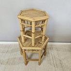 - Table dappoint - BambouMatériau : bambou; pays d’origine : europe; état : bon état avec de petites traces de vieillissement et taches; dimensions : 42 × 42 × 49 cm (h × l × p) et 39 × 37 × 33 cm; le lot est soigneusement em