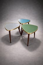 4 avr. 26domPeruwelz - Table dappoint - Formica, Bois, Laiton - Ensemble de troisEn provenance de france, ensemble de trois tables d’appoint nestables au style mid-century modern, plateaux formica à bord doré, en vert, bleu et gris, sur pieds tripodes en bois, années 1950, en exce