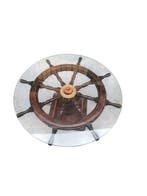 HiergeertLanden - Centre de table - Bois, Laiton, VerreTable en bois du xxe siècle tardif avec des accents en laiton et dessus en verre, présentant un timon de navire authentique en bois avec moyeu central, plateau rond en verre transparent, 92 cm de larg