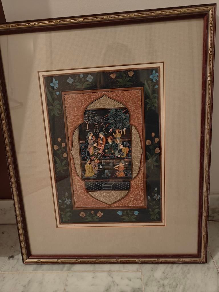 - Une peinture miniature encadrée dansCes peintures sont connues pour leur représentation détaillée de scènes de cour, de portraits, de scènes de chasse et d'histoires mythologiques. Le style combine des éléments de l'art persan eEnlèvement