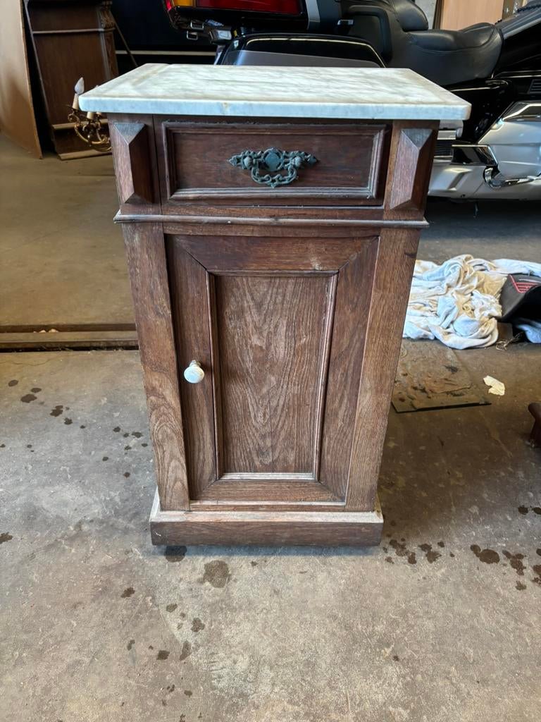Aujourd'huimaxdepescheCouvin - Meuble ancien en chêne- petit meuble ancien en chêne avec tablette en marbre, deux portes et deux tiroirs - la tablette n'est pas collée sur le meuble (voir photos) - largeur : 45cm - longueur : 90cm - hauteur : 87cm #Enlèvement