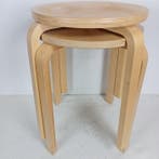 Aujourd'huiPub au topCatawikiToute la Belgique - IKEA - Tabouret (2) - Frosta - Multiplex berk - DeuxDeux tabourets frosta empilables d'ikea en bois de bouleau brun, design scandinave, datés vers 2000–2010, fabriqués en suède par ikea, chacun d'environ 46 cm de hauteur et d'un diamètre d&