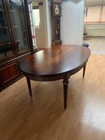 Tafel met inlegwerk en 6 stoelen in kerselaar. Bijhorend inlegstuk moet tafel te verlengen. 1,55 X 1,10 m, met verlengstuk van 45c