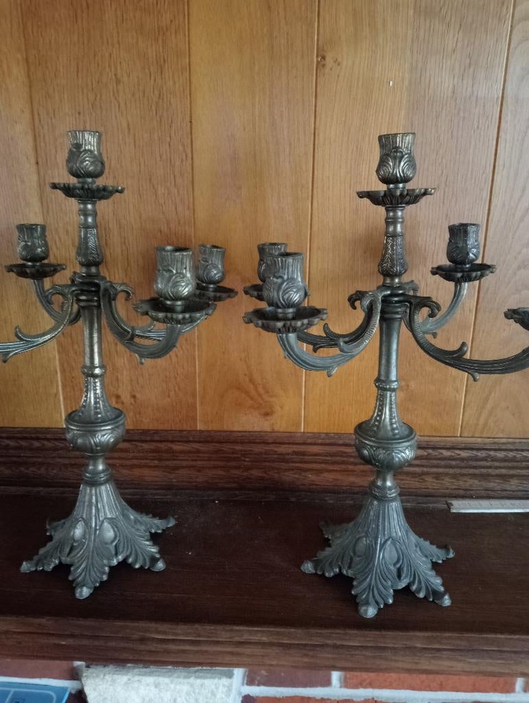 - 2 chandeliers, 5 bras de style baroque2 candélabres identiques d'époque, 5 bras, style baroque, en métal argenté. Classique, victorien ou baroque, caractérisé par des boucles et des volutes détaillées. Prise en charge au 9681 maarkedaEnlèvement ou Envoi
