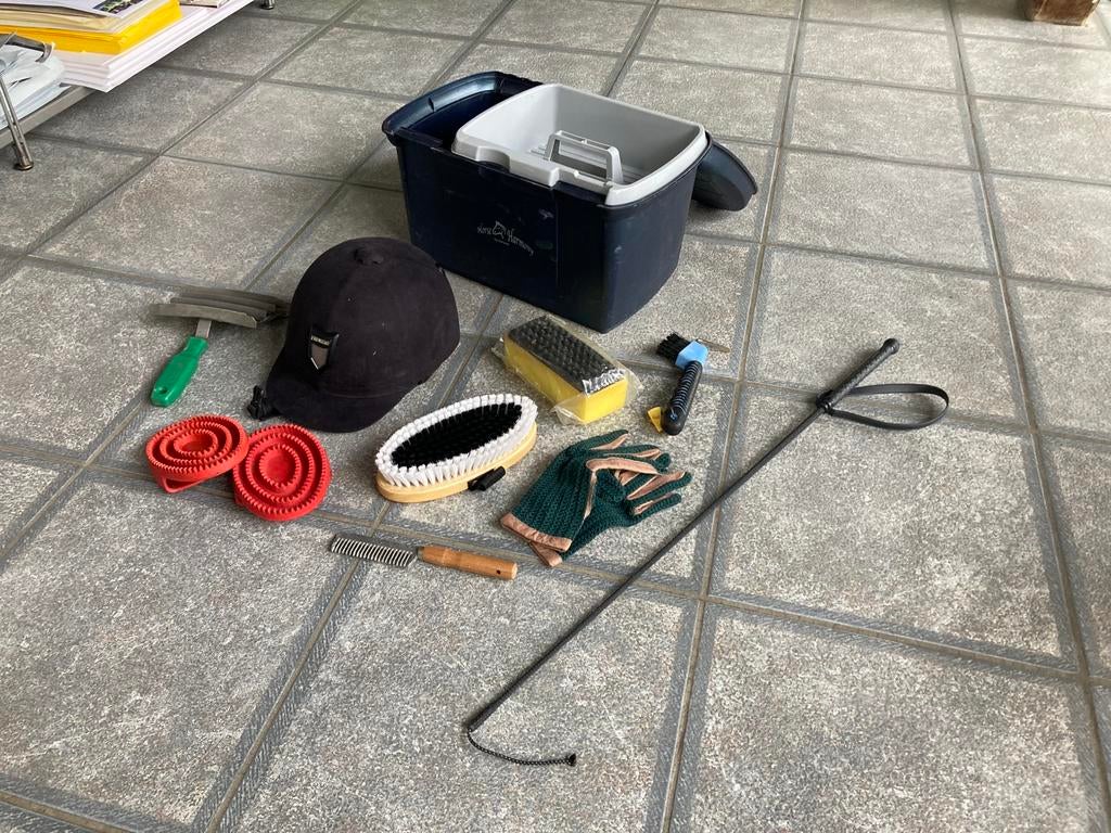 - Spullen voor paardrijdenVerschillende spullen voor paardrijden: tok, handschoenen, borstels, kist… als een geheel en per object apart te koop.Neuf Envoi