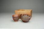 - Teapot with cups - Aardewerk - Bizen Yaki Ware - Japan -Japanse oorsprong bizen yaki ware theepot met twee sencha kopjes uit de meiji-periode, gemaakt van aardewerk en authentiek origineel, in uitstekende staat; theepot: breedte 8,5 cm, van handvat tot tui