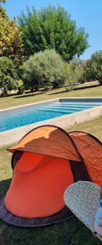 - 2 seconden tent baby voor in de tuin of op uitstap/vakantieDecathlon werp tentje met zelfopblazende luchtmatras met katoenen hoesje. Tent is uv en kan via verschillende plekken verluchten of net beschermen tegen de zon. In muggengaas is een kleine herstelling