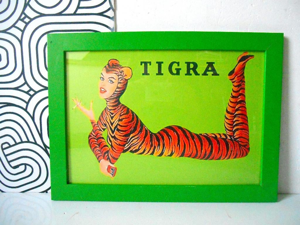 - Retro Tigra reclame in kader - 1(wegens verandering van interieur) - retro reclame voor tigra, - een iconisch belgisch sigaretten-merk - in groene houten kader - 25 x 34 cm extra info: het meisje op alle reclame van tigra was het anUtilisé Envoi