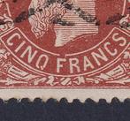 - Belgique 1878 - 5F rouge-brun Leopold II avec timbre àBelgique, 1878, oblitérée, intitulée « 5f bruinrood leopold ii met rolstempel ("roulette"), met curiositeit ! », Répertoriée obp/cob 37-cu.