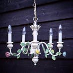 Aujourd'huiPub au topAgrodieren.beBeernem - Lustre - Fer - Tole rosesLustre vintage blanc en fonte et tole, roses et feuilles, cinq bras, diamètre 51 cm, hauteur 39 cm (66 cm avec la chaîne), fabriqué en italie et daté de 1950–1960, en bon état avec de légères traces d