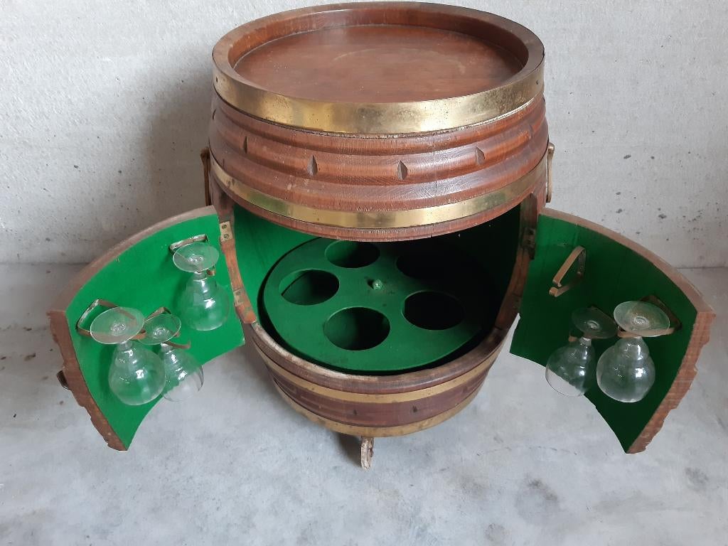 - Tonneau à vin sur roulettes, transformé en meuble de barTonneau à vin avec 2 portes ouvrantes. À L'intérieur, il y a de la place pour 4 bouteilles de vin ou de whisky sur une plate-forme rotative. Il y a de la place pour 6 verres à vin dans les portes.Enlèvement