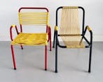 - Kinderstoel (2) - gelakt staal - kunststof koord, StaalSet van twee spaghetti/scoubidou kinderstoelen uit belgië, ca. 1960–1980, Met een gelakt stalen frame en koordzitting, afmetingen stoel 1: 31 cm breed x 49 cm hoog x 29 cm diep met zithoogte 27 cm, en