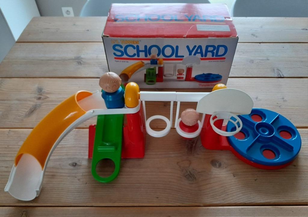 - Vintage Li'L Tupperpers School Yard Tupperware Tuppertoys 19Jouets li'l tuppers school yard toy vintage 1989 pour enfants, jouets éducatifs pour enfants de 2 ans et plus. Boîte d'origine. Il manque la boule rouge. En excellent état vintage.Enlèvement ou Envoi
