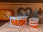 Setje ramequins: 1 grote schaal en 2 bijhorende potjes geschikt voor dessertjes, salades, sausjes… voor de vintage liefhebbers, kijk zeker ook een keertje bij mijn andere advertenties met arcopal lotu