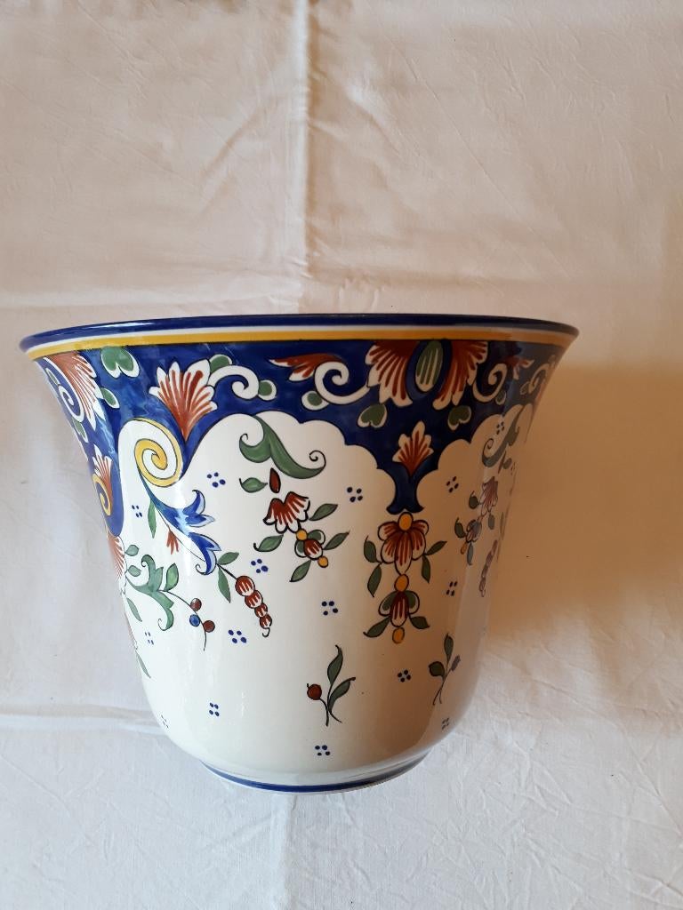 22 mars 26marinaHerk-De-Stad - 3 Faiences Rouen anciennes1- vase signé desvres décor rouen peint à la main, hauteur 23 cm , diamètre 13 cm 2- cache pot peint à la main signé mont saint michel, hauteur 10 cm et diamétre12 en décor rouen 3- assiette rayonnantEnlèvement ou Envoi