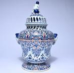 - Desvres - Vase - Poterie - Faïence, pot-pourri, vaseVase-bouquet en faïence polychrome de style rouen, 1850–1900, forme balustre sur piédouche, ajour au col et sur le couvercle, deux mascarons en visages d’enfants comme poignées, culot surmonté d’un pu