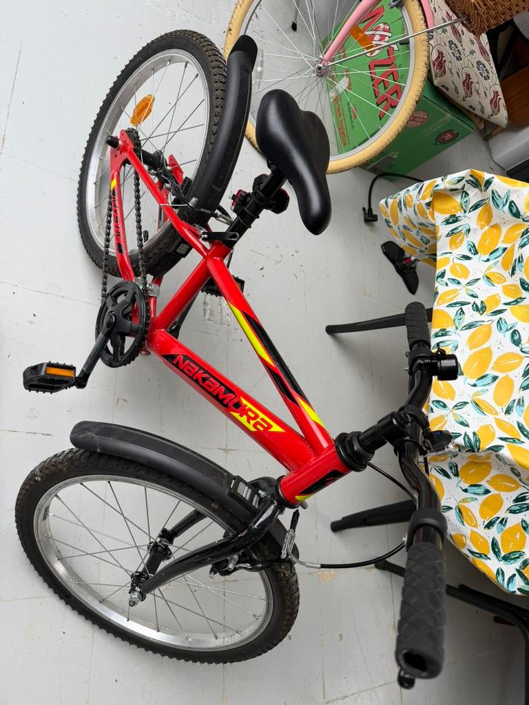 - VTT enfant Nakamura — 20 pouces — Bon étatVtt enfant nakamura (intersport), cadre rouge/jaune/noir, roues 20 pouces, dérailleur, garde-boue. Bon état généralComme neuf Enlèvement