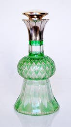 Aujourd'huiPub au topCatawikiToute la Belgique - Carafe - Argent 800 - Verre coloré à décor tailléCarafe art déco à monture en argent (.800) Et bouchon en liège, verre coloré avec décor taillé, allemagne, datée 1910–1920, en bon état avec de légères traces d’usure; dimensions 18,5 cm de haut, 9 cm
