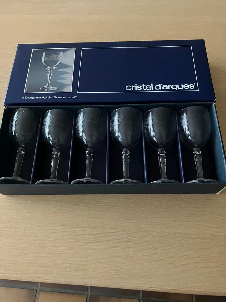 14 sept. 25jourdechineJemappes - 6 verres à liqueur en cristal d'Arques NEUFS6 verres à liiqueur luminarc, cristallerie d'arques, anciens mais n'ont jamais servi; dans la boîte d'origine; 5 cm de hauteur et 4 cm de diamètre; avec déco dorée; autres verres en cristNeuf Enlèvement ou Envoi