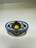 - Inktpot - Porselein, Messing, BronsFranse faïence inktpot met een ovale vorm, met een metaalachtige montuur van koper/brons, afkomst uit frankrijk en gedateerd op 1850-1900, in goede gebruikte staat met kleine verouderings- en vlekken,
