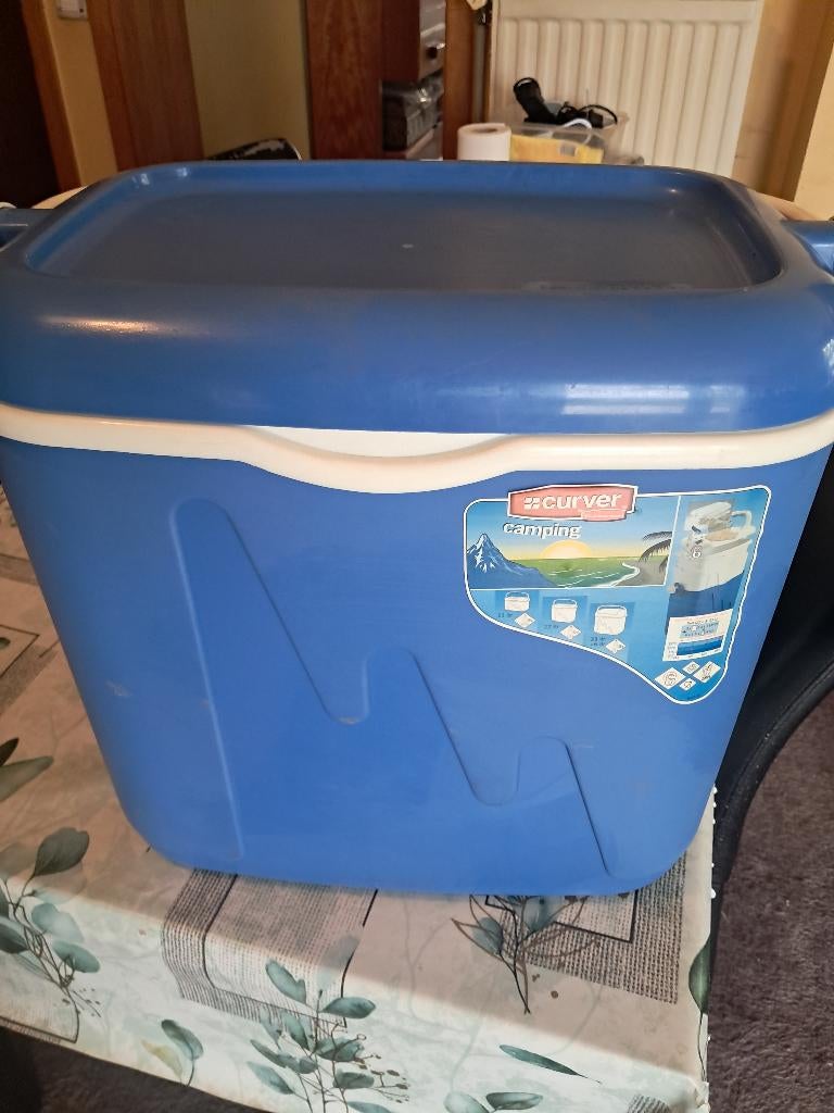 24 mars 26YvanJabbeke - Très rare grand frigo box vintage années 70 seventiesGlacière frigo box de camping ou pique nique vintage années 70 en plastique orange et bleu marine pour le couvercle maintenu par deux clips poignées -intérieur blanc- poignée métal et plastique blancEnlèvement