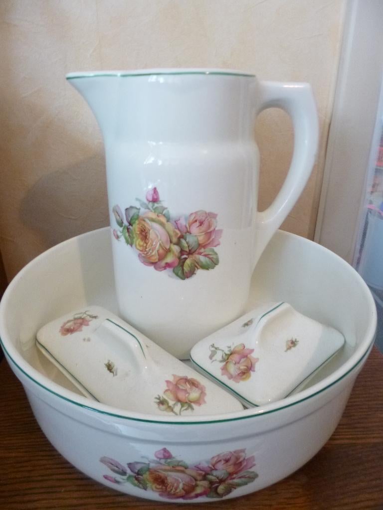 3 avr. 24KADEHouthulst - Porseleinen toiletset St. Amand-Hamage-OrchiesHéél mooie oude porseleinen wasset st. Amand-hamage-orchies. Set bestaat uit : 1 wasteil, 1 gietkan, 1 toiletpot, 1 zeepbakje, 1 kammenbakje (er is een klein stukje uit het deksel van het kammenbakje,Enlèvement