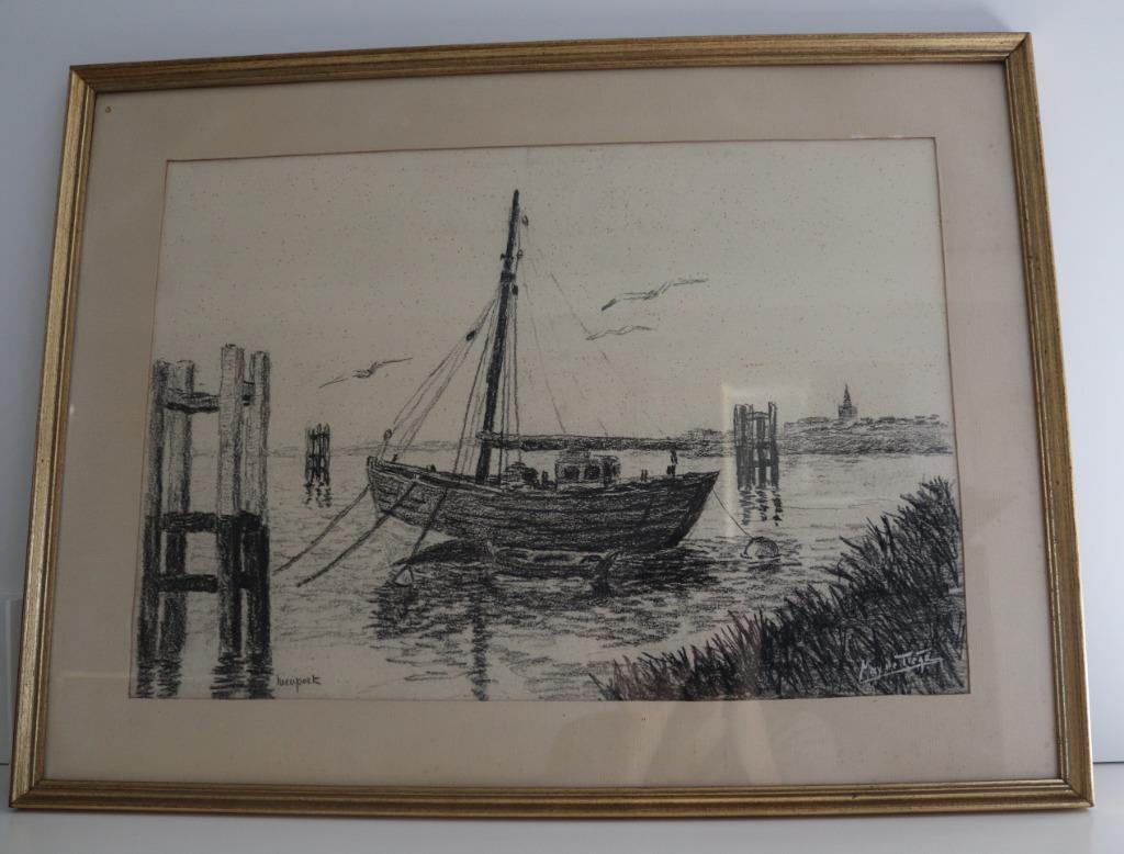 26 mars 26DAVIDWestende - Nieuport de Max de TiègeCanal du port de nieuport avec canards et bateau de pêche, avec l'église de lombardsijde en arrière-plan, dessin au fusain, derrière une vitre. Dans un cadre doré 35x50 cm (sans cadre) 48x64 cm (aEnlèvement ou Envoi