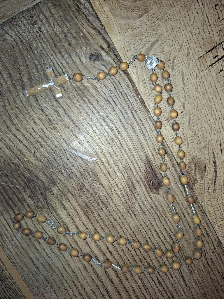 13 janv. 26patrickBilzen - oude paternoster-rozenkrans palmhout, begin 1900Oude paternoster-rozenkrans palmhout,begin 1900 oude paternoster met ronde eiervormige palmhouten bolletjes met een houten kruisje met zilveren christus en een medaillon met aan beide zijde een heiligEnlèvement ou Envoi