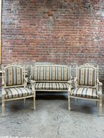 Elegante antieke franse salonset bestaande uit een canapé (bank), twee bijpassende fauteuils en een bijbehorende tafel. De set is uitgevoerd in de klassieke louis xvi-stijl met verfijnd gesneden houte
