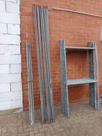 Gegalvaniseerde metalen bouwstelling. Kan tot 6 meter hoog, met 4 verstelbare poten. 1 Kader staat aan 1 zijde licht krom (zie foto)