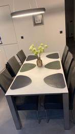 Te koop: moderne eettafel met glazen blad en stevig metalen frame, inclusief 6 bijpassende stoelen. De set is zeer goed onderhouden, stabiel en zonder mankementen. Tijdloos design, makkelijk in onderh