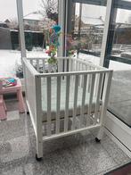 Park in zeer goede staat (geen bijtschade) met bijhorende matras (dikte 8cm) en gewafelde parklegger of boxkleed in lichtgroene kleur. Afmetingen: lxbxh, 100x80x94cm. Bodem verstelbaar op 3 hoogtes. H