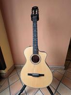Forme grand concert avec pan coupé table en épicéa de sitka massif, fond et éclisses en sapele massif, manche en acajou, touche en ébène, 17 frettes diapason: 648 mm, largeur au sillet: 47,60 mm systè